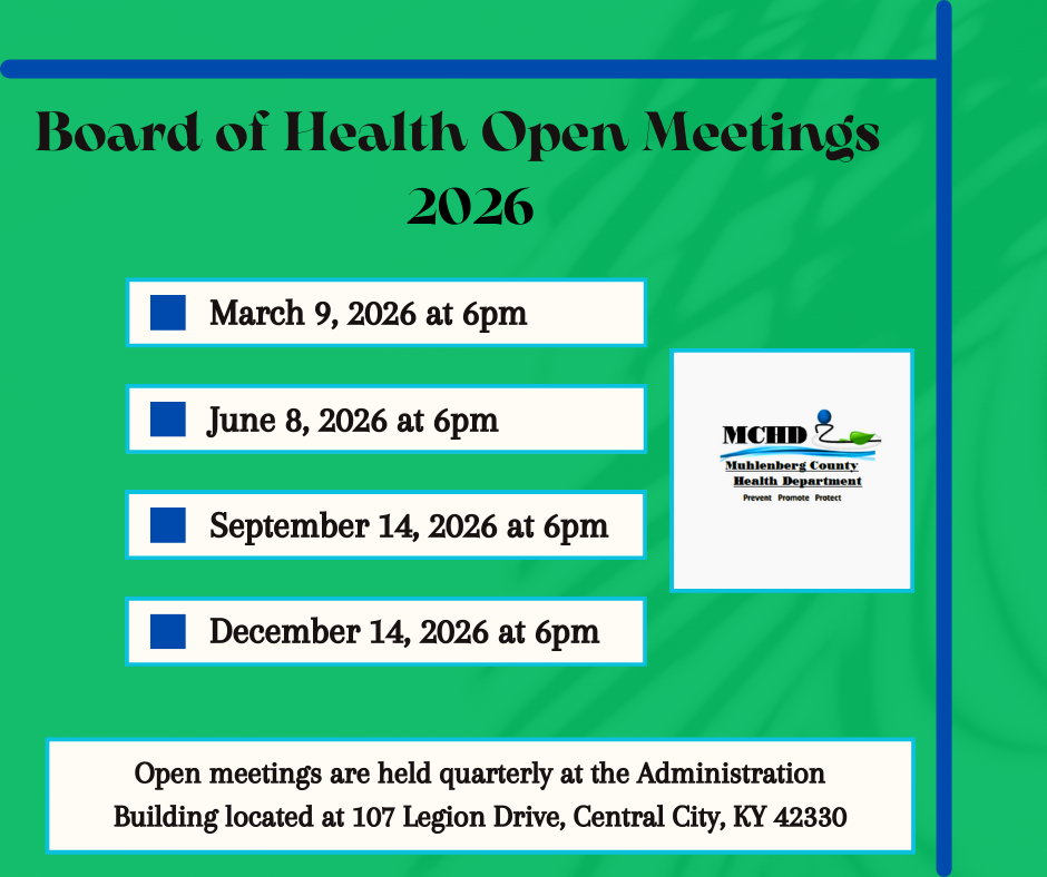 The Muhlenberg County Health Department mission is to prevent illness and injury, promote good health and a assure a safe environment to protect and improve the health of our citizens. Our vision for the community of Muhlenberg County is to have a healthy and safe environment which allows all children and adults to live so that they are able to prosper physically, emotionally, spiritually and financially in the pursuit of their purpose and dream for their lives.